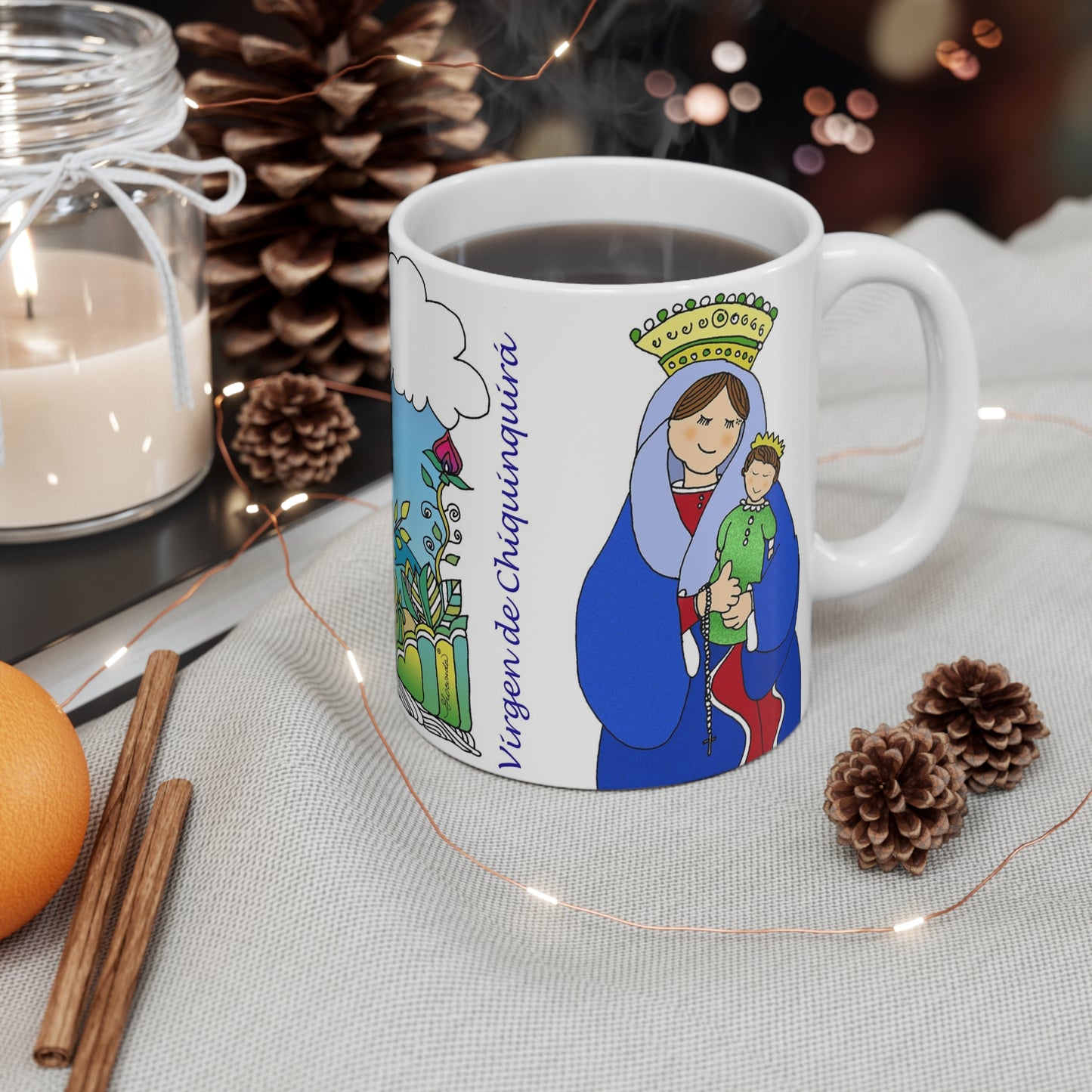Tazas de inspiración mariana, que nos presenta Gioconda Vivas, artista responsable de la ilustración Nuestra Señora del Rosario de Chiquinquirá, que adorna nuestra taza.